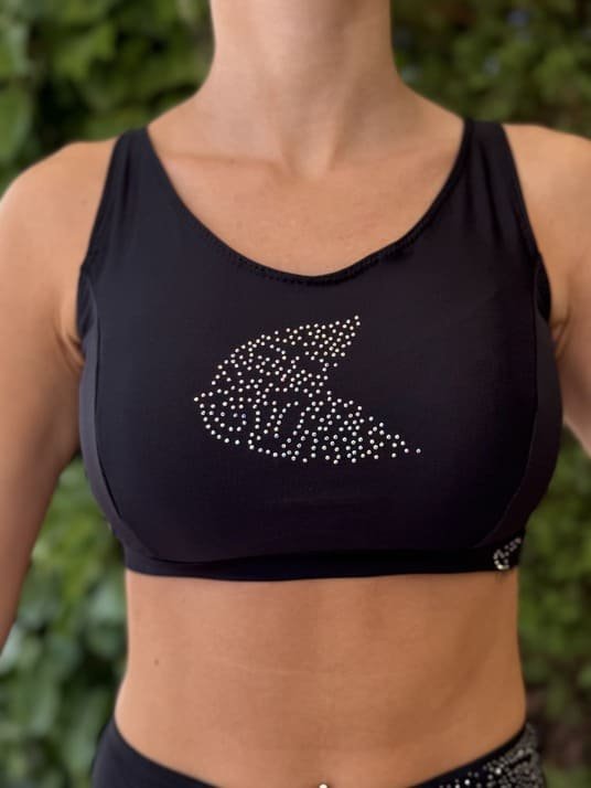 Su diseño en color negro transmite elegancia y versatilidad, mientras que los strass decorativos de alta calidad lo elevan a un nivel diferente: un top deportivo con un sutil toque de brillo que realza tu estilo y te acompaña tanto en entrenamientos como en ocasiones más casuales. El equilibrio entre funcionalidad y estética lo convierte en una prenda única que destaca sin esfuerzo.
